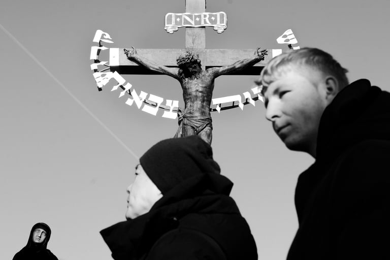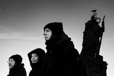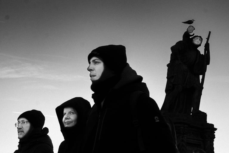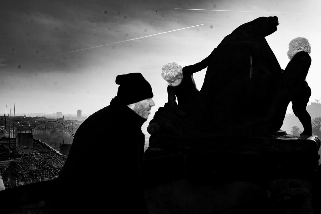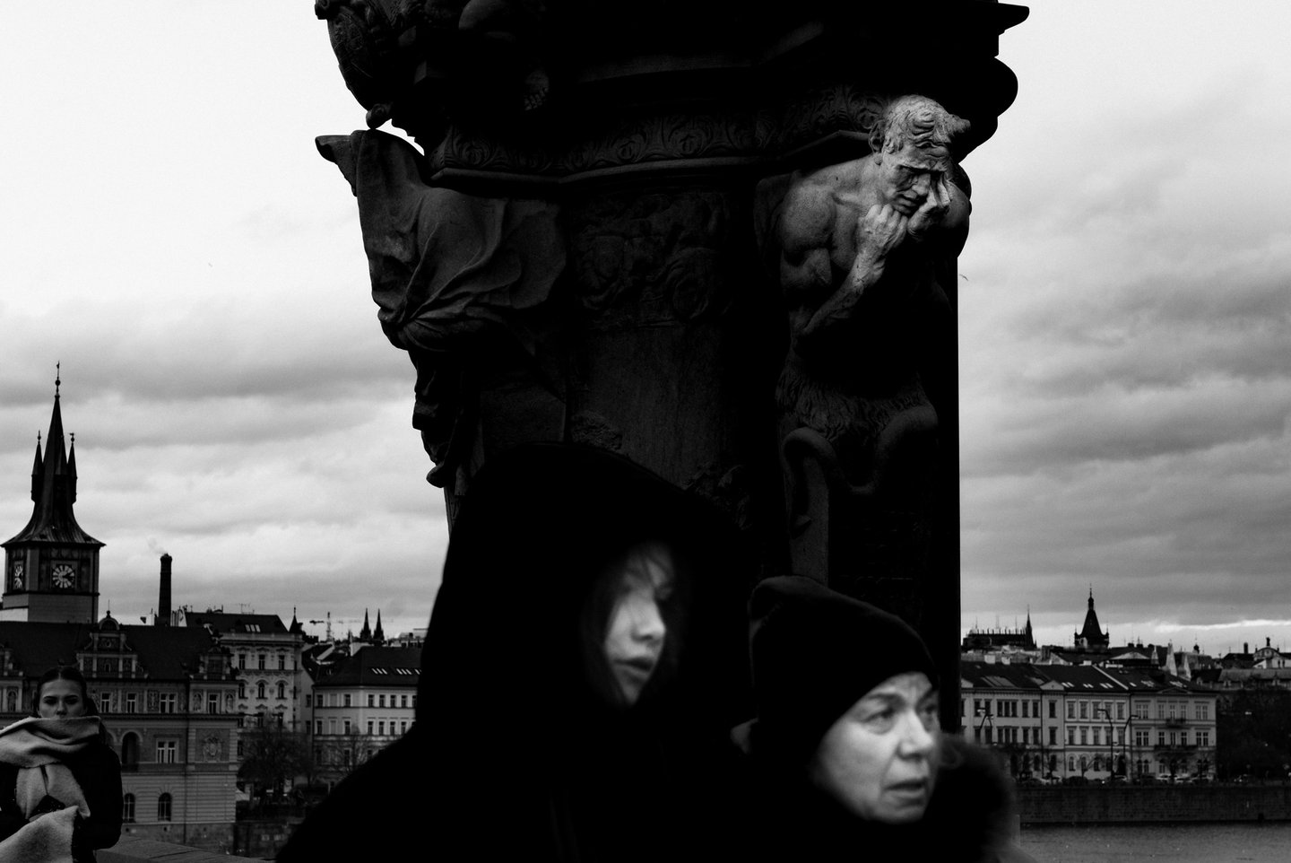 So I returned to Prague in January and spent an entire day, in below-zero temperatures, photographing the statues and the people. I spent most of that freezing day on Charles Bridge. The wind chill was close to –10 °C, and I had underestimated the cold and had not gone out with appropriate gloves. Because of that, I alternated between moments photographing and moments taking refuge in a small café at the end of the bridge, where I would order a hot drink. I still do not know whether it was more to warm my body from the inside or to bring back to life the fingers that held the mug.