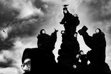 The photographs in this project were taken in Prague in December 2024 and January 2025. I had gone to spend Christmas in a town near the Czech Republic’s capital and took the opportunity to visit Prague for the first time. Once there, I was struck by the “weight and lightness” of the city, its robust buildings, the sharp-spired castle, the endless stairways, the bridge and its statues which, far from being inert blocks of stone, seemed to closely watch the endless flow of tourists who, like me, took photos, fed the birds, enjoyed a cup of mulled wine while waiting for sunset and for the lamps to be lit, setting the landscape ablaze.